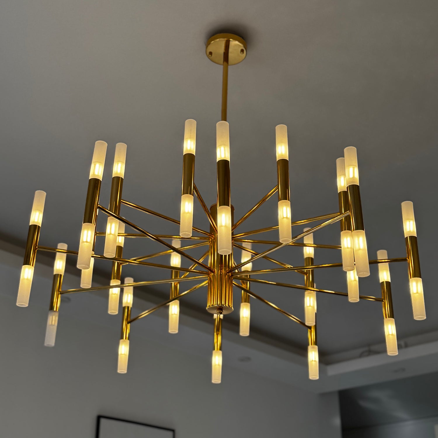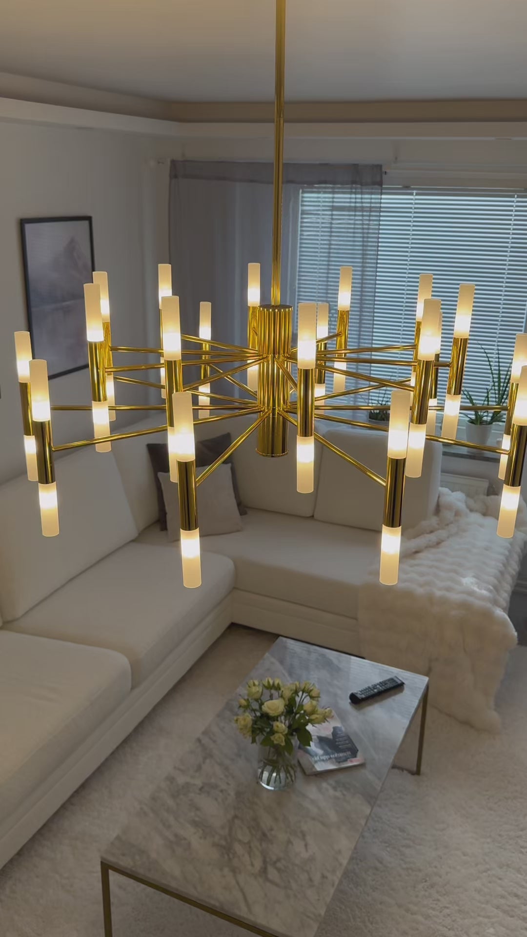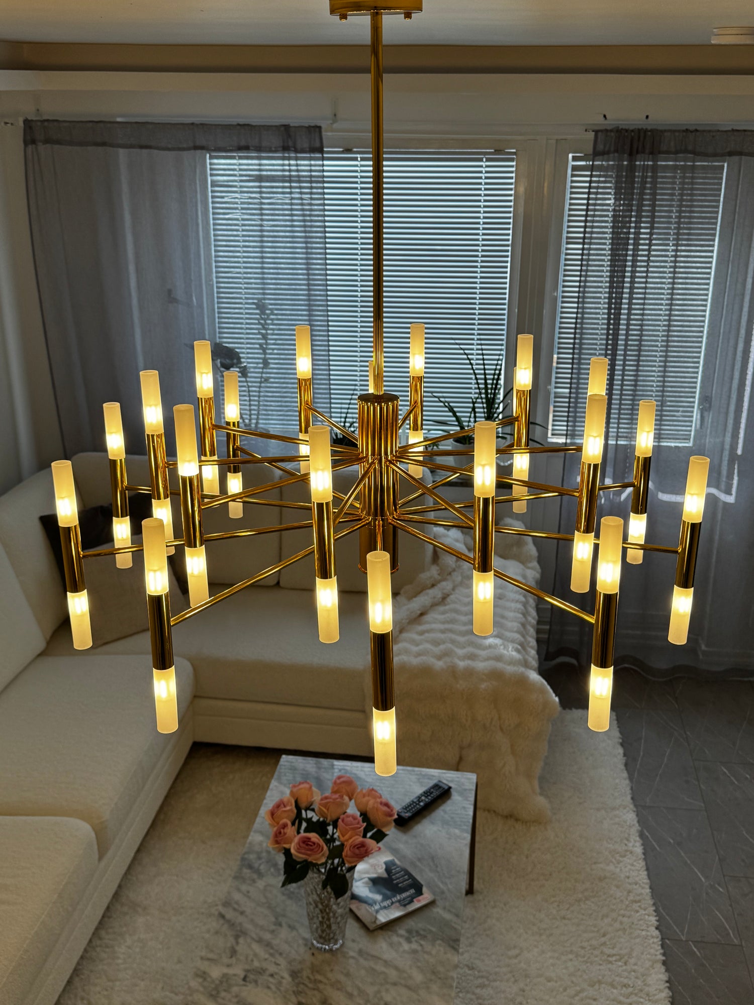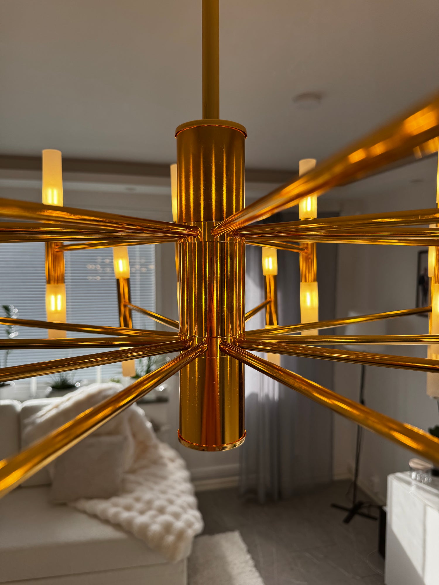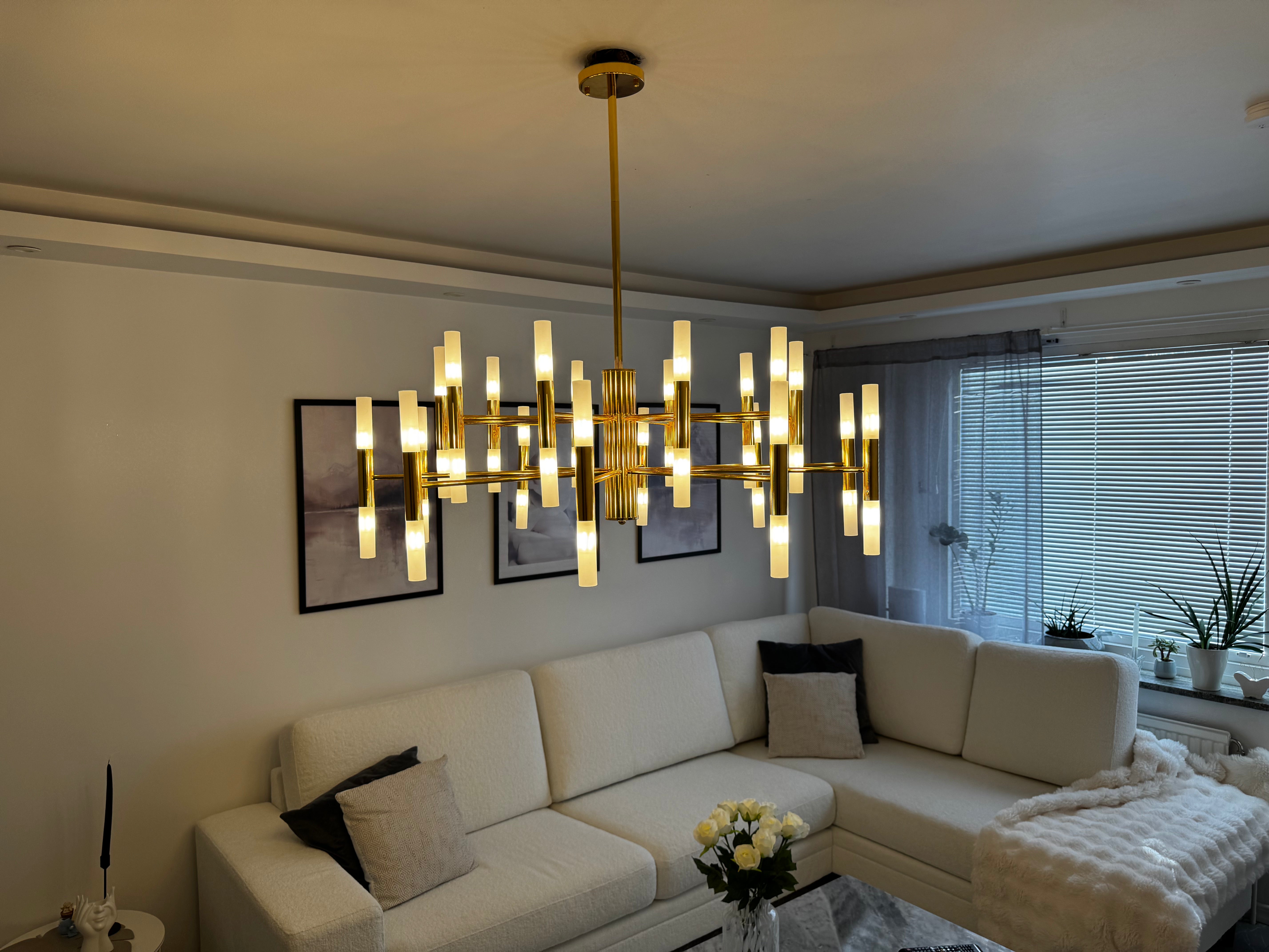Stor Taklampa Geneva är en modern takpendel med en generös diameter på 100 cm och tre höjdalternativ: 53, 63 eller 73 cm. Den imponerande storleken och den eleganta gyllene finishen gör den till ett naturligt blickfång i vardagsrum, matsalar och entréer. Har du extra högt i tak? Kontakta oss så anpassar vi längden efter dina behov för en perfekt installation.