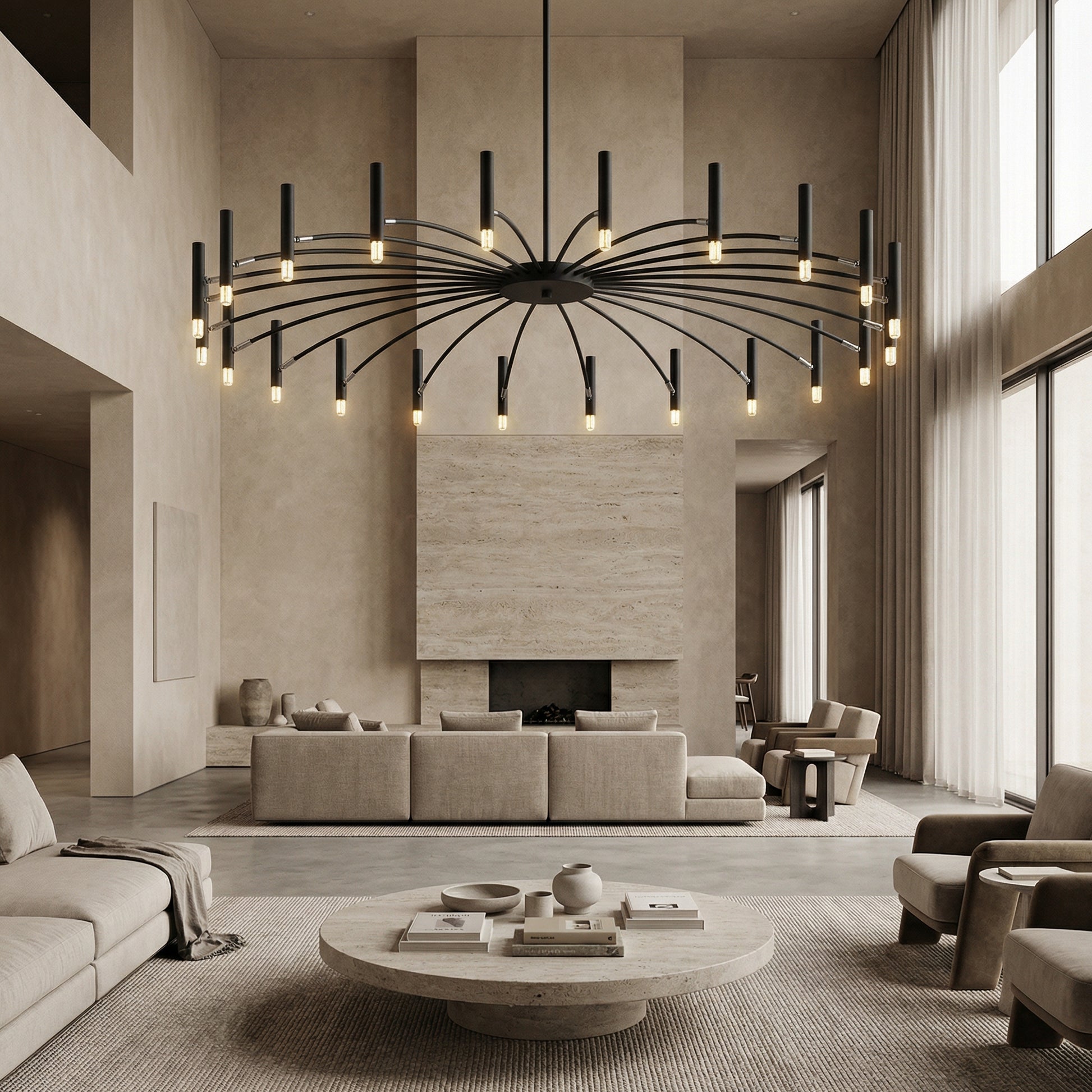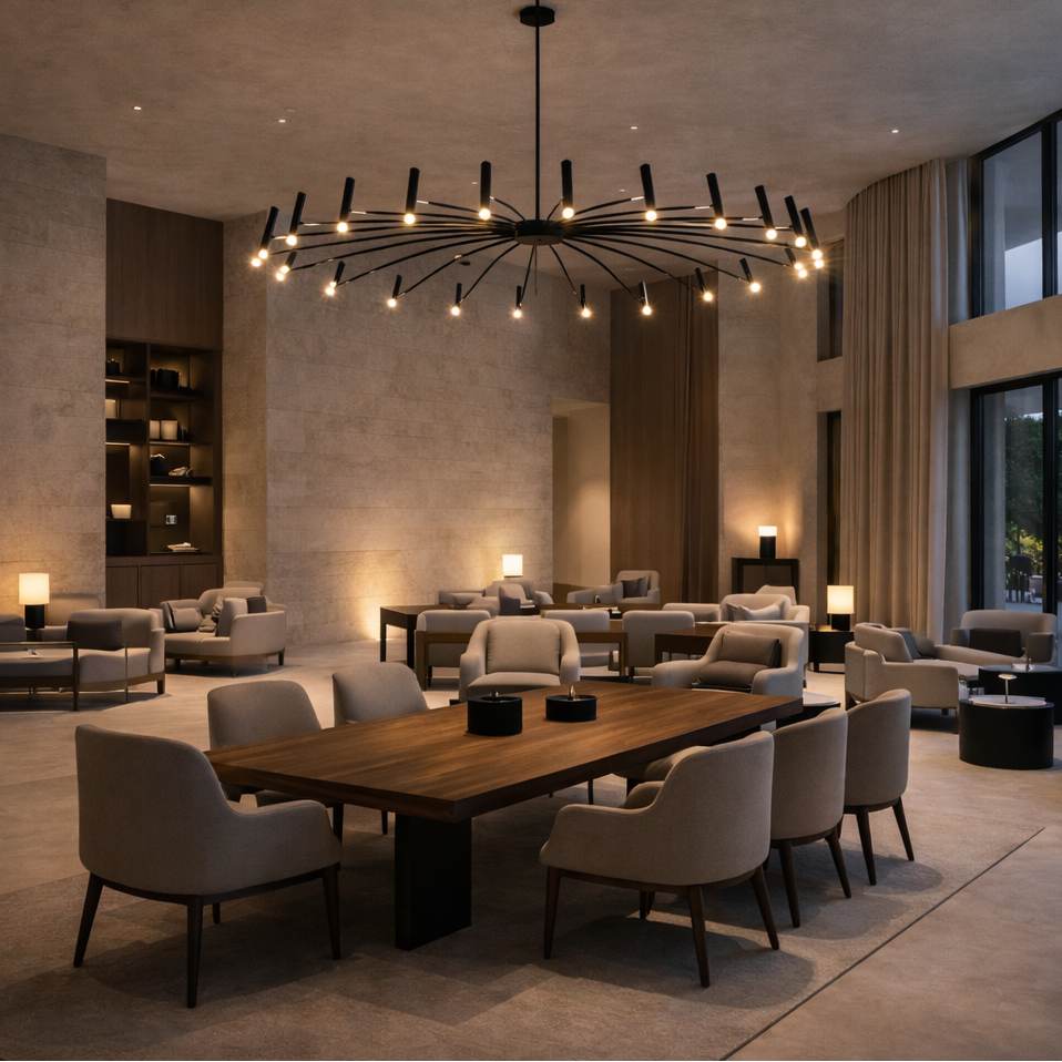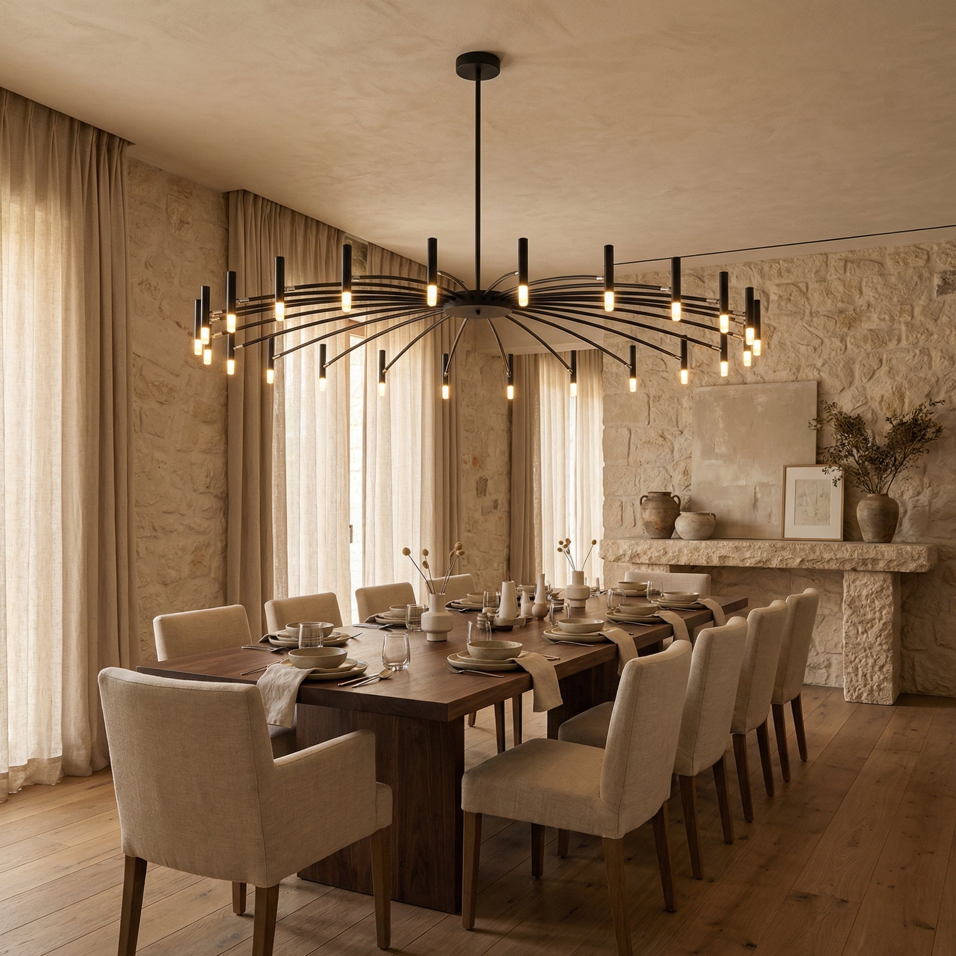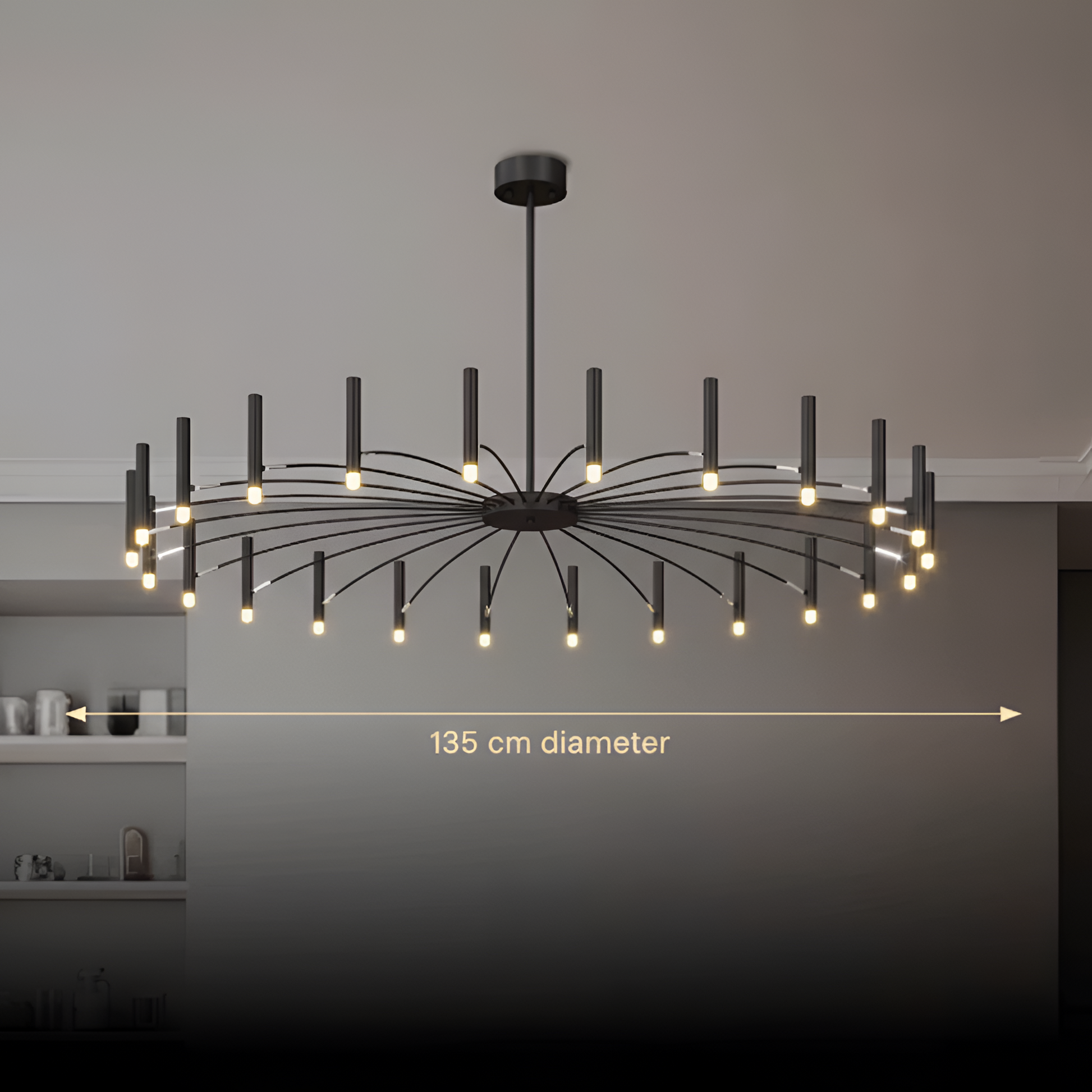 Ja, Taklampa Venice är designad för större utrymmen och passar utmärkt över långa matbord, i vardagsrum och i öppna ytor där en stor taklampa behövs som både belysning och designstatement.